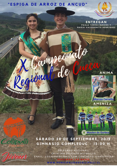 COLLIPULLI.-  Este sábado a partir de las 15,00 horas en el gimnasio del Complejo Educacional Collipulli, se desarrollará una nueva versión regional del Campeonato de Cueca Espiga de Arroz de Ancud, región de La Araucanía.-