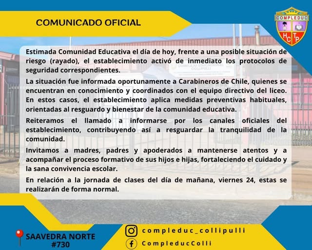 Local COMUNICADO OFICIAL DEL COMPLEDUC ANTE POSIBLE SITUACIÓN DE RIESGO 🏫 Por Staff Radio - 23 de abril de 2026 0 69 FacebookTwitterPinterestWhatsApp