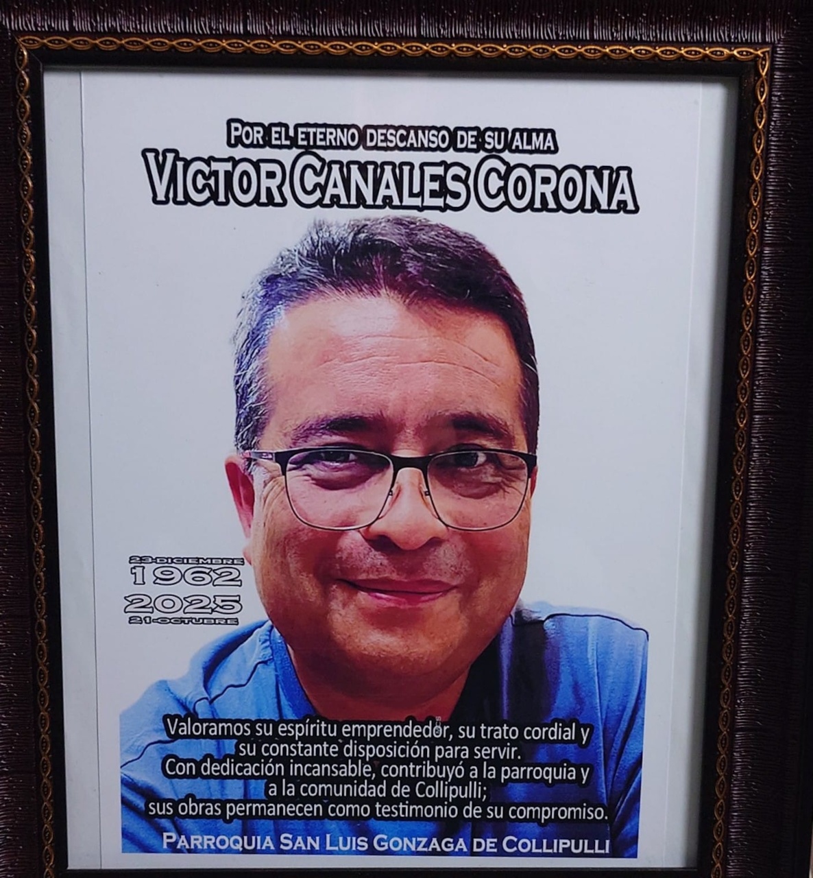 La Parroquia San Luis Gonzaga de Collipulli agradece de corazón a Víctor Canales Corona y a su familia, por la entrega generosa y los frutos de servicio que, en vida, ofreció incansablemente a la comunidad y a la obra de Dios.