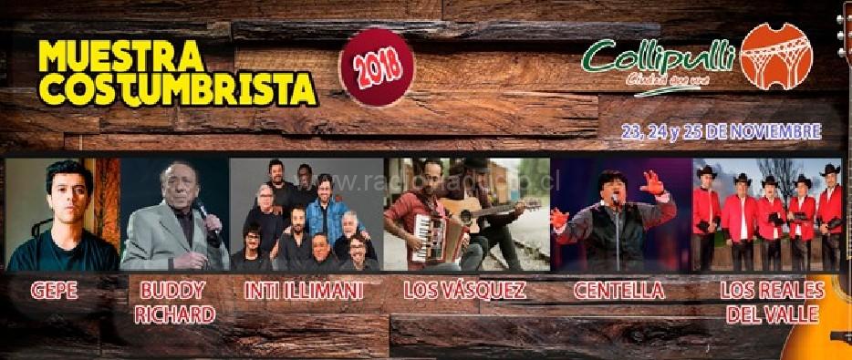 COLLIPULLI.- La información entregada a VIADUCTO FM da cuenta de la parrilla artística, encargada de animar la Muestra Costumbrista de Collipulli, que se desarrollará los días 23, 24 y 25 de noviembre en el sector de la Medialuna del Club de Rodeo Chileno Collipulli.-