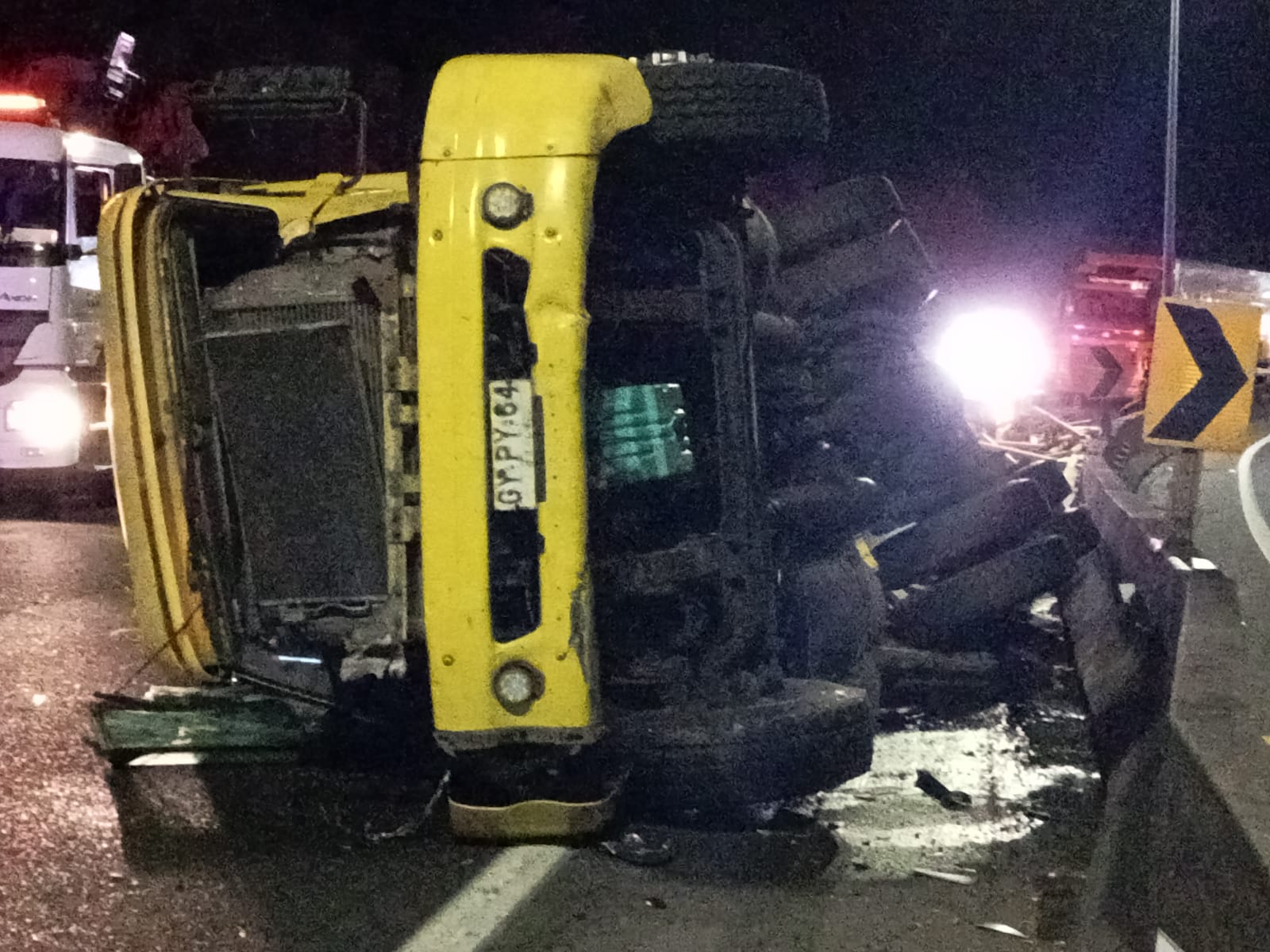 El conductor de este camión resultó con diversas contusiones, siendo atendido en el lugar por personal paramédico de ambulancia correspondiente a la empresa concesionaria ruta sur.-
