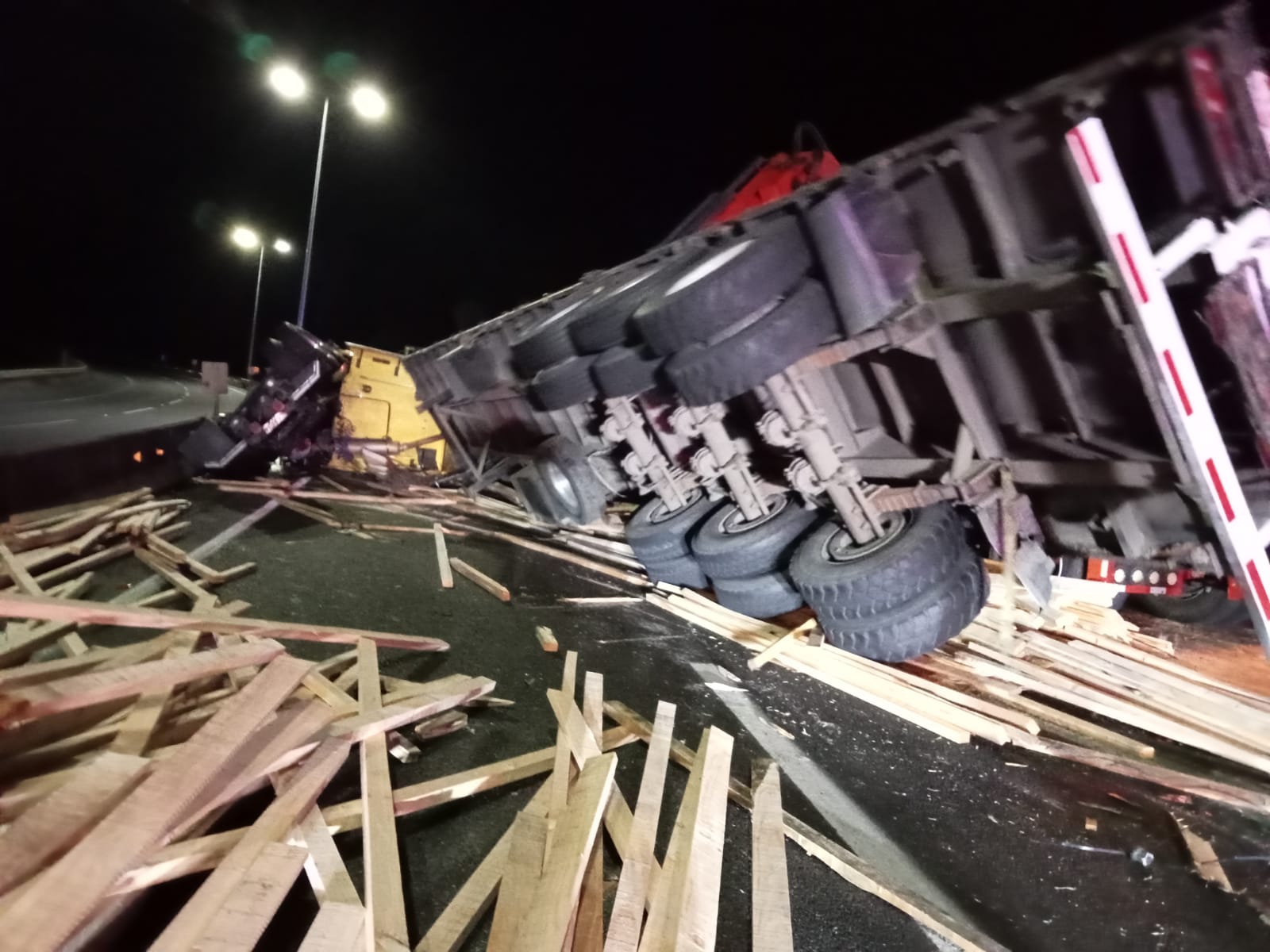 COLLIPULLI.- El volcamiento de un camión, cargado con madera en Ruta 5, cuesta Esperanza, mantuvo por varios minutos cortada la principal vía del país en ese sector, 15 kms. al norte de Collipulli, pista sur a norte.